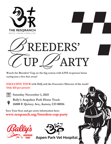 Have you ever wanted an excuse to head out to see live horse racing right here in Colorado? Did you even know we have a local track where you can get up close and personal with magnificent Thoroughbred race horses? Well then, now is your chance! The ResqRanch is having our WINTER HAY Fundraising party next Saturday.