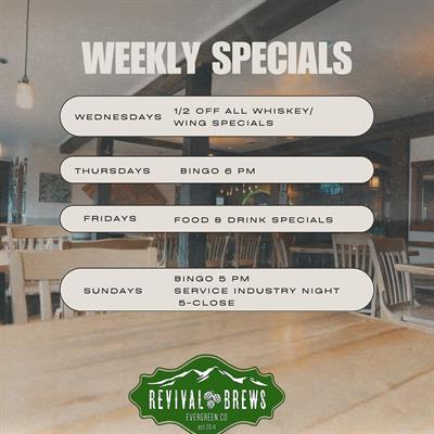Wednesdays- Happy Hour 3 to 5pm!! Half off Whiskey & $5 off Wings open to close. Come try some amazing Colorado Whiskeys for half the price! Try our delicious wings with your choice of one of our craft house made sauces $5 off. Cheers!